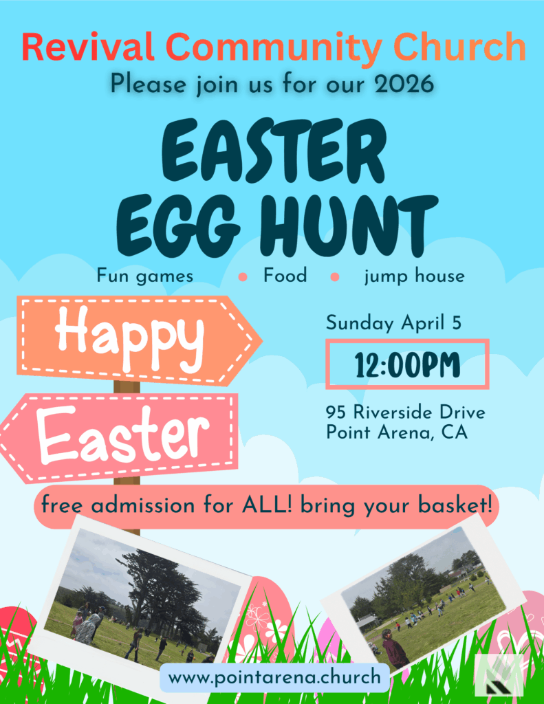 Revival Community Church in Point Arena, California, warmly invites you to join us in our journey of faith and fellowship. Our mission is to spread the Good News and share God’s love with everyone we encounter. As a united congregation, we are committed to diligently seeking the Lord, deepening our faith, and embodying the fruits of the Spirit in our daily lives. We strive to create a welcoming environment where individuals can grow spiritually and find a sense of belonging. Whether you’re exploring your faith or looking for a community to call home, we would love for you to be part of our mission to bring others to Jesus and experience the transformative power of His love. Come and visit us to see how we can grow together in faith.